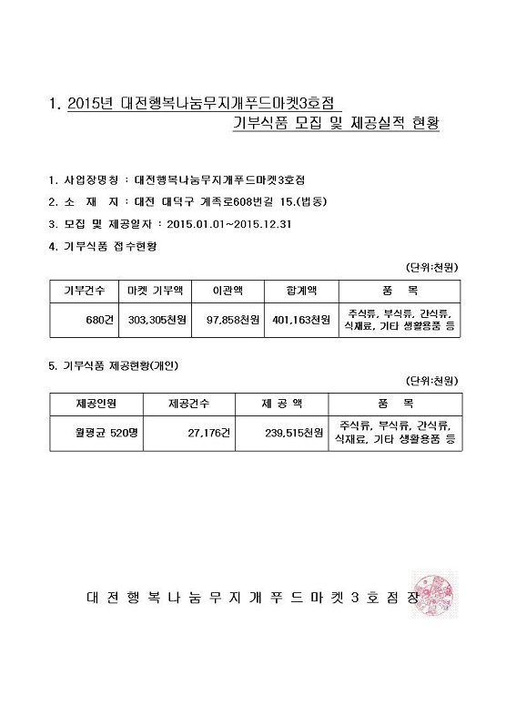 19-03-28 11:27 대전행복나눔무지개푸드마켓3호점 2015년 기부식품 모집 및 제공실적 현황 페이지 정보 작성자 성우보육원 댓글 0건 조회 5,633회 본문 2015년 기부식품 모집 및 제공실적 현황 목록 댓글목록 댓글목록 등록된 댓글이 없습니다.