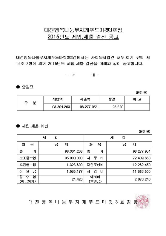 19-03-28 11:27 대전행복나눔무지개푸드마켓3호점 2015년도 세입.세출 결산 공고 페이지 정보 작성자 성우보육원 댓글 0건 조회 5,723회 본문 2015년도 세입.세출 결산 목록 댓글목록 댓글목록 등록된 댓글이 없습니다.