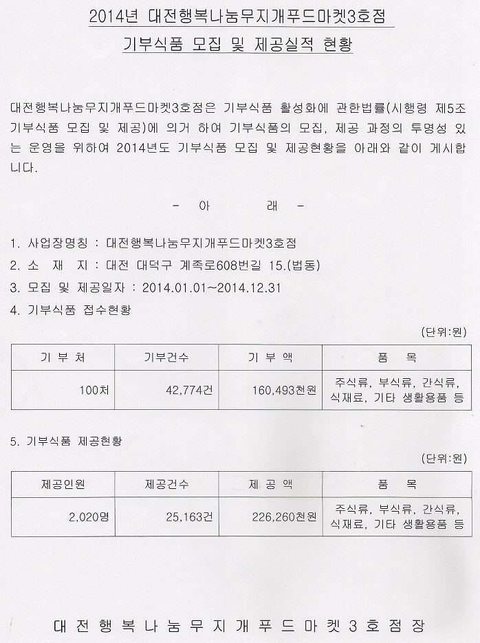 19-03-28 11:04 2014년도 대전행복나눔무지개푸드마켓3호점 기부식품 모집 및 제공실적 공고 페이지 정보 작성자 성우보육원 댓글 0건 조회 4,951회 본문 2014년도 대전행복나눔무지개푸드마켓3호점 기부식품 모집 및 제공실적 공고 목록 댓글목록 댓글목록 등록된 댓글이 없습니다.