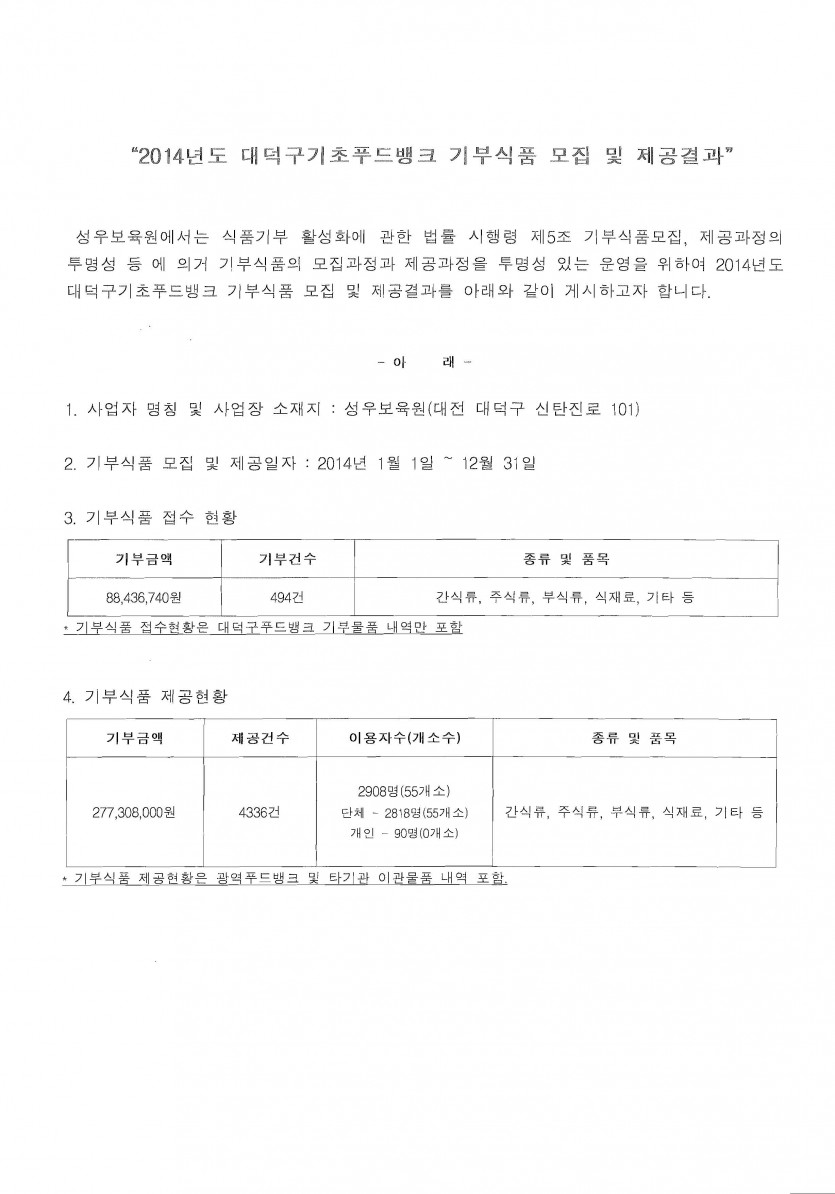 19-03-28 11:21 2014년 대덕구기초푸드뱅크 운영실적(기부식품 모집 및 제공결과) 페이지 정보 작성자 성우보육원 댓글 0건 조회 5,714회 본문 2014년 대덕구기초푸드뱅크 운영실적(기부식품 모집 및 제공결과) 을 게시합니다. 목록 댓글목록 댓글목록 등록된 댓글이 없습니다.