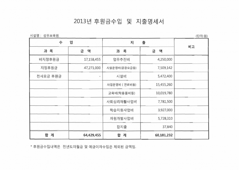 19-03-28 10:59 <공고>2013년 후원금 수입 및 지출명세서 페이지 정보 작성자 성우보육원 댓글 0건 조회 6,087회 본문 2013년 후원금 수입 및 지출명세서 목록 댓글목록 댓글목록 등록된 댓글이 없습니다.