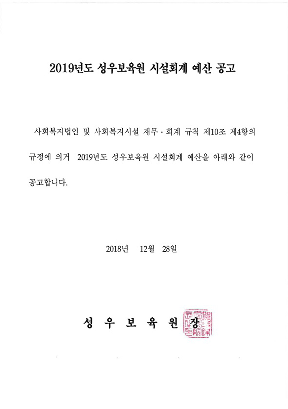 18-12-28 11:48 (공고) 2019년도 성우보육원 시설회계 예산 페이지 정보 작성자 성우보육원 댓글 0건 조회 5,809회 본문 2019년도 성우보육원 시설회계 예산 공고입니다. 목록 댓글목록 댓글목록 등록된 댓글이 없습니다.