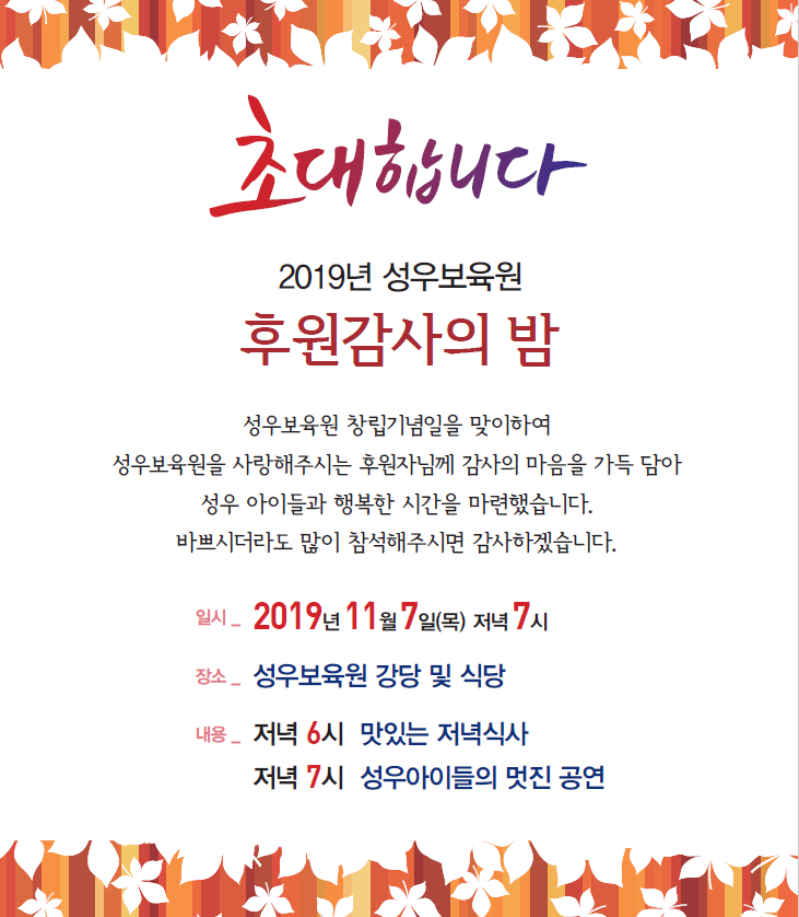 19-10-24 14:59 (초대합니다) 2019년 성우보육원 후원감사의 밤 (11월 7일 오후7시) 페이지 정보 작성자 성우보육원 댓글 0건 조회 5,455회 본문 2019년 성우보육원 후원감사의밤 많은 참석부탁드립니다! 목록 댓글목록 댓글목록 등록된 댓글이 없습니다.