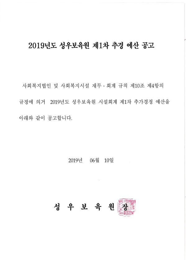 19-06-10 16:54 (공고)2019년도 제1차 추경 예산 페이지 정보 작성자 성우보육원 댓글 0건 조회 5,886회 본문 2019년도 제 1차 추경예산 공고입니다. 목록 댓글목록 댓글목록 등록된 댓글이 없습니다.