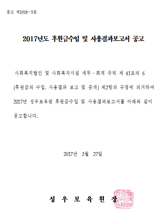 2017년도 후원금 수입 및 사용 결과 보고를 공고합니다.