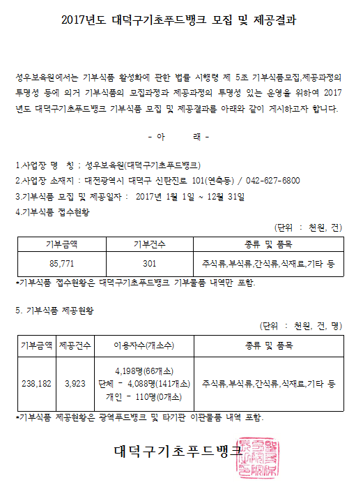 19-03-28 11:43 2017년도 대덕구기초푸드뱅크 모집 및 제공결과 페이지 정보 작성자 성우보육원 댓글 0건 조회 5,527회 본문 2017년도 대덕구기초푸드뱅크 모집 및 제공결과 목록 댓글목록 댓글목록 등록된 댓글이 없습니다.