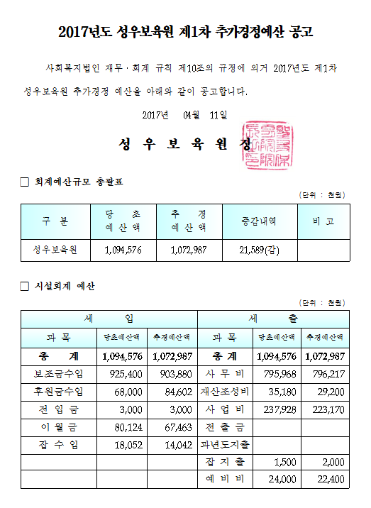 19-03-28 11:38 (공고)2017년 제1차 추가경정 예산 공고 페이지 정보 작성자 성우보육원 댓글 0건 조회 5,573회 본문 2017년 제1차 추가경정 예산 공고 목록 댓글목록 댓글목록 등록된 댓글이 없습니다.