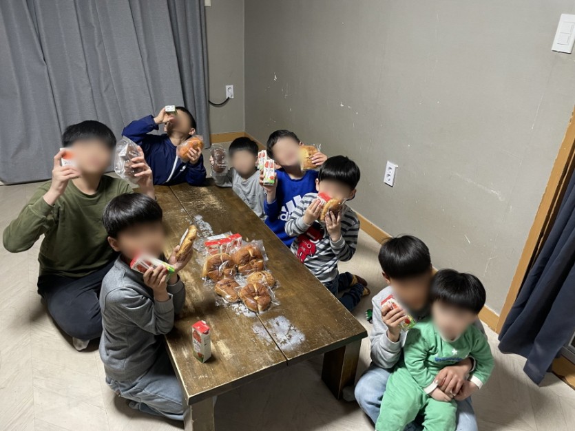 아이들이 모두 맛있는 빵과 음료를 먹으며, 행복한 간식 시간을 보냈습니다^^
