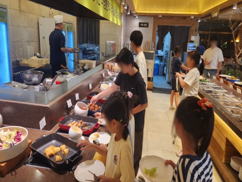 아이들이 원하는 음식을 자유롭게 담으며 웃음이 끊기지 않고